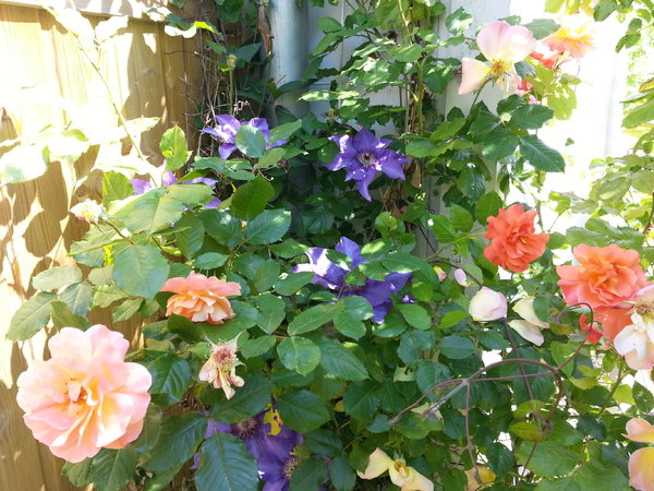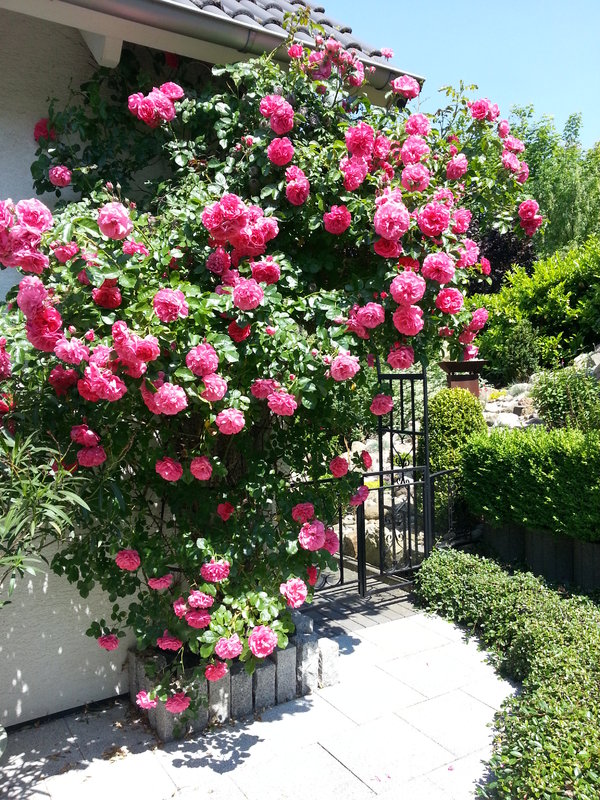 Die Rose ist eine Looping (hält die Blüten leider nicht sehr lange), die Clematis ein Rouge Cardinal