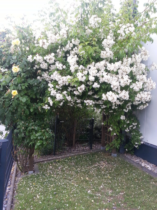Links eine Golden Gate, rechts eine Bobby James. Wobei man die Ausmaße dieser Rose auf dem Foto gar nicht erkennen kann. Der Rosenbogen auf dem sie wächst hat über 2 m Höhe. Irgendwie hatte ich gehofft, dass sie durch den Betonkübel in dem sie steht, sie nicht so riesig werden würde.
