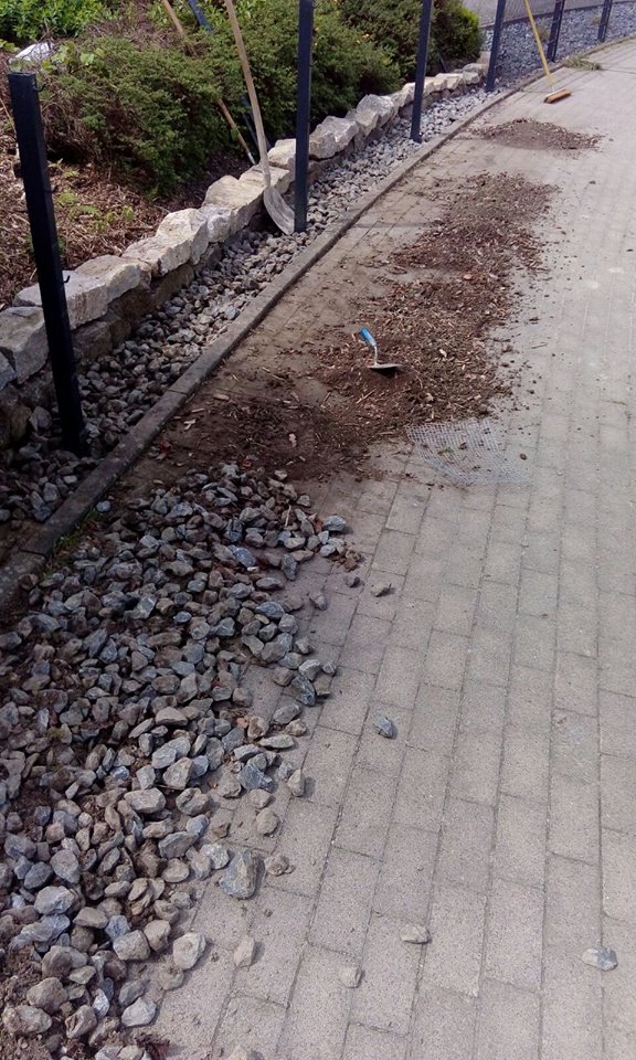 Das haben wir im letzten Jahr halt "grob" mittels Wasserschlauch wieder sauber gespült. Allerdings war so viel Lehm zwischen den Kies gespült worden, dass das Unkraut nun flächendeckend aufging und sich nicht mehr rausziehen ließ. Also Zaun abgebaut und mittels Maurerkelle das Lehm-Kies-Gemisch bis zum verlegten Trennvlies "raus gepult". Der Gedanke es mittels Schüppe raus zu schaufeln hat leider nicht funktioniert - es war wie Beton.