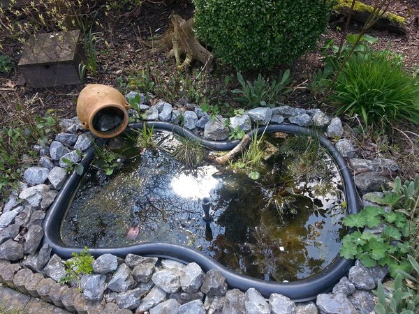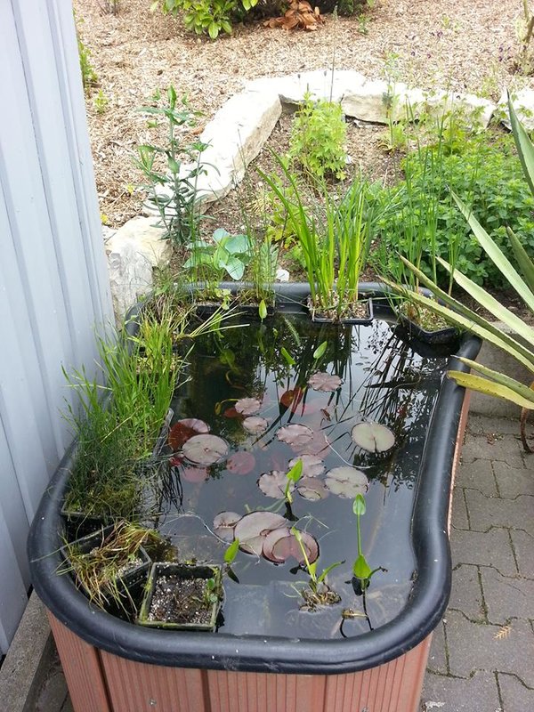 Nachdem ich mich jetzt mehrere Jahre darüber geärgert habe, dass mein einer Miniteich ein einziges Algenloch war, habe ich ihn gestern kurzerhand entfernt. Die noch verwertbaren Pflanzen sind umgezogen in unseren anderen, der komischerweise ganz klares Wasser hat.