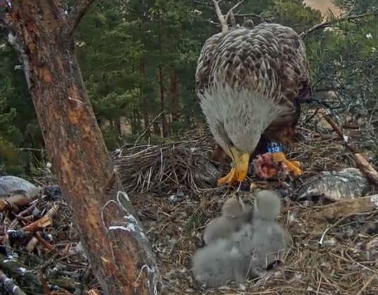 Heute früh hab ich lange beim Füttern zugeschaut. Die Kleine hat keinen Bissen bekommen und dann hat sie der Adler wieder auf alle gesetzt und sitzt immer noch. Da tut einem der Kleine richtig leid aber die Natur wird schon wissen was richtig ist.