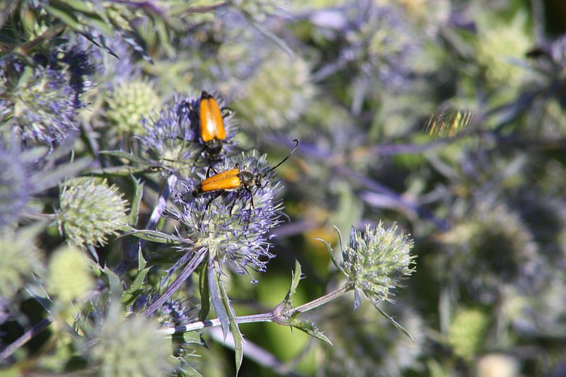 Auf dem zweiten Bild ist eine Fliege, erkennbar an den sehr kleinen Fühlern. Auf Bild fünf sind Rothalsböcke♂♂, nur die ♀♀ haben einen roten "Hals". Bild 6 sind Bienen, 7 eine Holzbiene und 10 gehört zum formenreichen Kreis der Heufalter (Coenonympha)