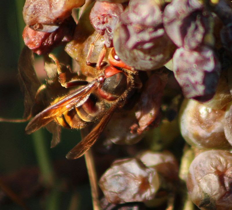 Die Hornissen erfreuen sich an den Trauben, aber auch Bienen werden von dort weg geschnappt und verspeist.Auch einige Falter fliegen noch.