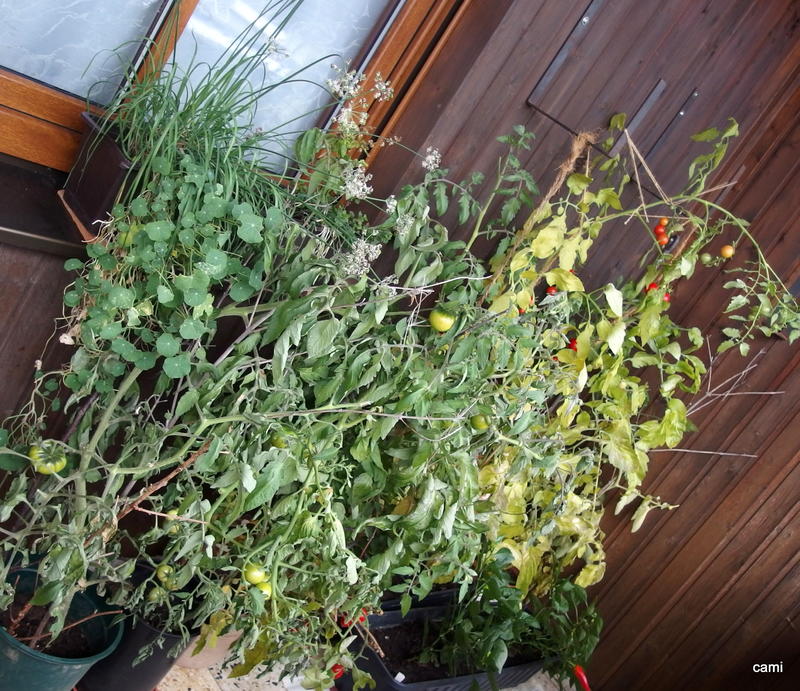 Meine Tomaten habe ich abgeräumt, weil ich keine Früchte mehr dran hatte. Die paar grünen Tomaten habe ich zum Nachreifen ins Haus geholt.