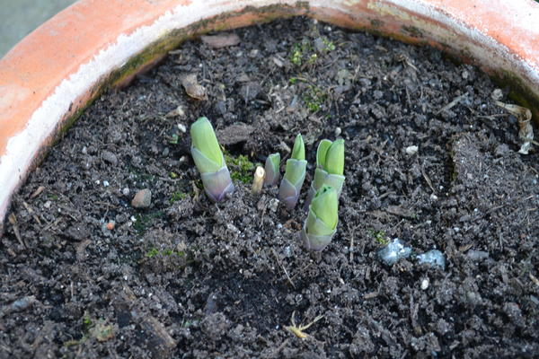 Eine Hosta im Topf überwinterte unter einem niedrigen Strauch .Die Hälfte des Topfes (etwas grösser) hab ich in Häckselgut v.Miskanthusgräsern eingebettet u.obenauf auch eine Schicht drüber. Am Sonntag hab ich ihn frei gelegt u. siehe da ca.2cm hohe Hörnchen gucken schon raus. Der Topf war 1,5 Monate mit gefrorenem Schnee bedeckt.