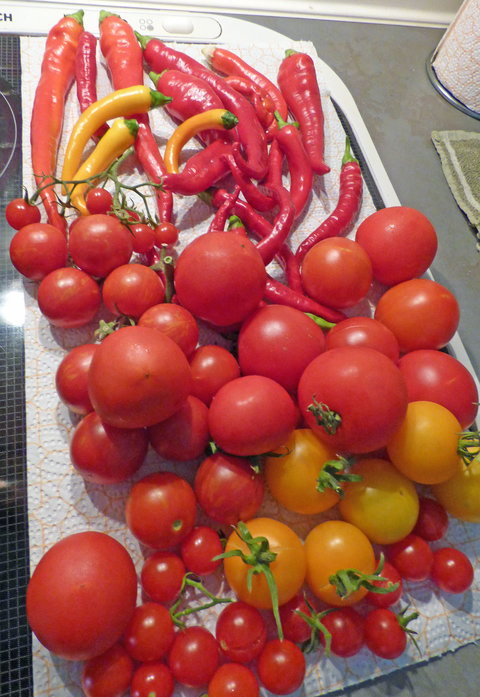 Obwohl wir am Samstag unseren Besuch schon Tomaten und Paprika mitgegeben haben blieb für die Ernte gesten noch jede Menge übrig.