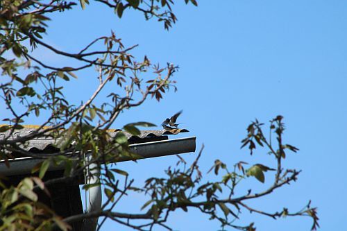 Jedenfalls sehe ich jetzt immer ein Köpfchen im Nest. Es sind auch ab und zu zwei vor dem Haus auf Nahrungssuche.