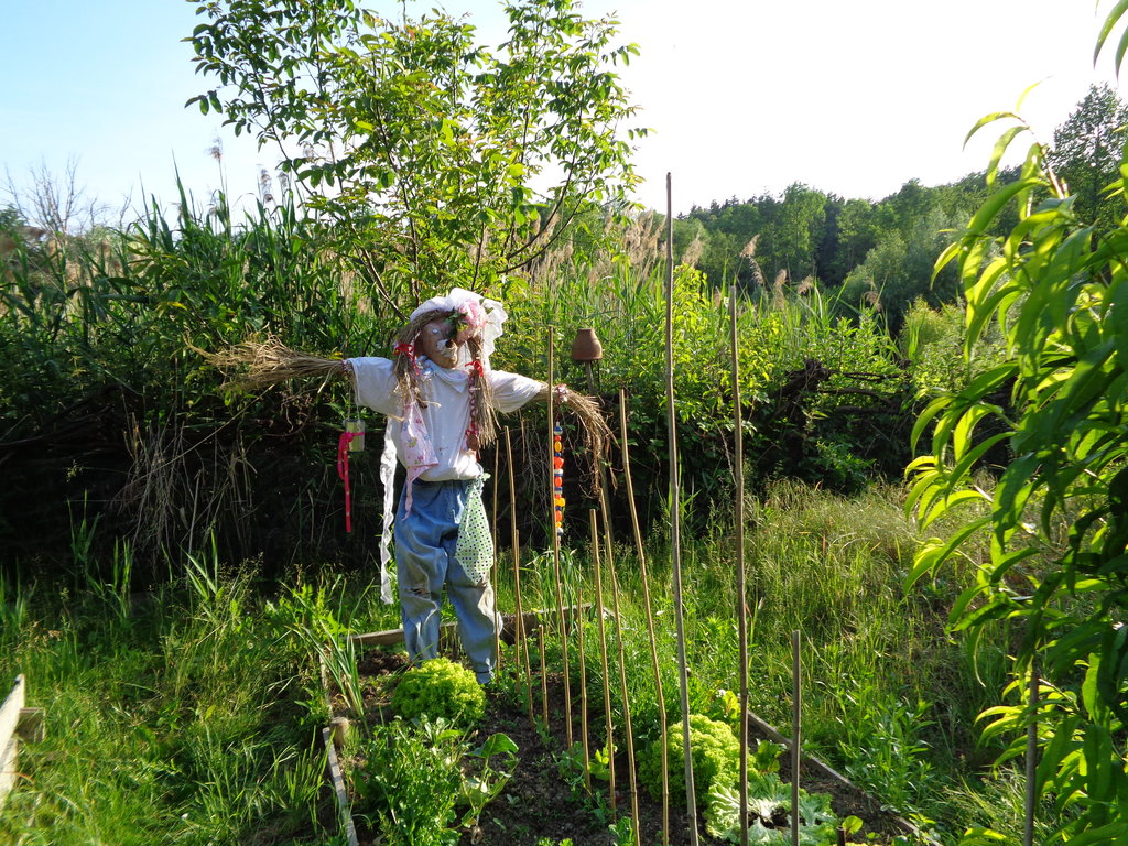 Ich hoffe, daß sich eher die Hasen und die Rehe vor der Vogelscheuche fürchten. Leider macht sie weniger Lärm als wir gehofft haben. Trotz Blechdose mit Kronenkorken drin und verschiedenen Babyrasseln und Schellen.......