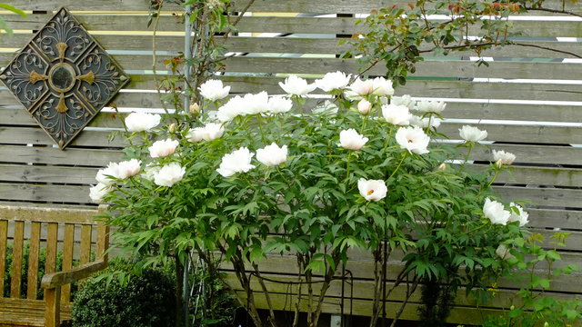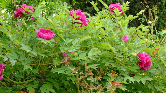 Ich habe die Pfingstrosen im Garten zusammengesammelt und sie auf einen Zentralen Platz gestellt. Nebenbei habe ichmir drei Baumpfingstrosen zugelegt, wobei die erste schon die Blüte anzeigt