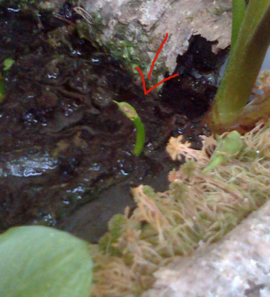 So jetzt erstmal die Sumpfcalla, man hat die einen Zahn zugelegt und auch ein kleines Blütelein angesetzt, ich dachte immer die kommen bei den Blattachseln raus, ist wohl nicht so.