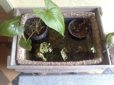 Die Pflanze links ist ein Versuch, es ist eine Zimmercalla die gerne feuchte Füße hat, seitdem sie da drin ist wächst sie sehr gut. Rechts im Topf ist der kleine Rohrkolben.