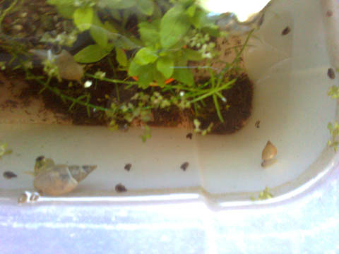 Schnecken sind Allesfresser. Man kann sie außer mit Fischfutter auch mit Trocken-Hunde- oder Katzenfutter füttern. Die Spitz-Schlammschnecken kann man draußen überwintern, selbst wenn es bis zum Grund friert. Dieoben gezeigten Pflanzen sind eigentlich tropische Aquarienpflanzen (Limnophila sessiliflora und wahrscheinlich Ludwigia. Du tust gut daran, sie möglichst spät und dann bei bedecktem Himmel oder im Schatten (für einige Tage) wieder raus zu bringen.