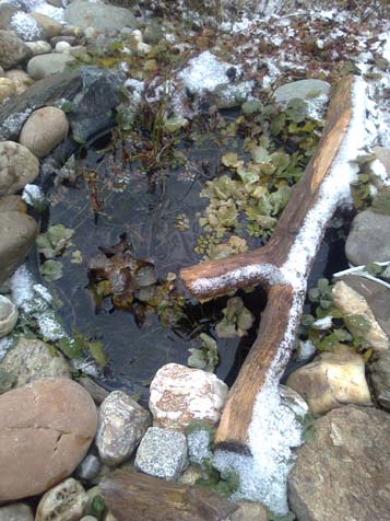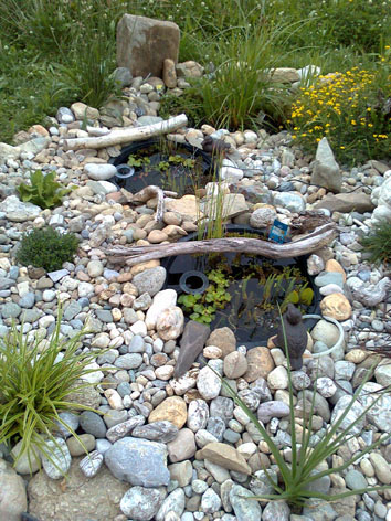 Du kannst aber auch einen leicht gebogenen Ast über den Miniteich legen, der mit seiner Biegung im Wasser hängt, so können die Vögel vom Ast aus Wasser trinken.