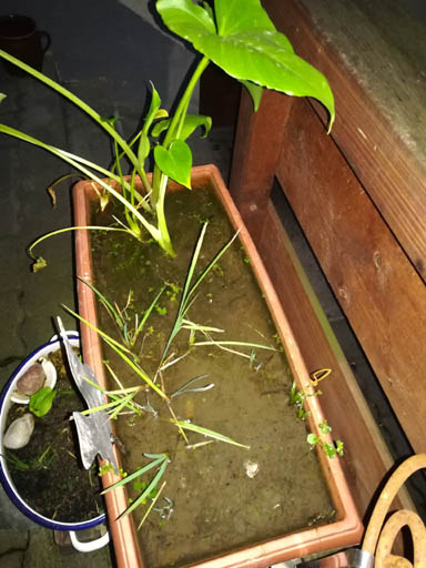 Supmfwanne unten und Sumpfkasten oben im Bild. Der Fröschlöffel in der Sumpfwanne hatte diese Jahr einen sehr hohen Blütenstand entwickelt