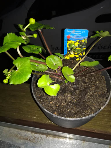 Dann hab ich noch in einer rechteckigen Mörtelwanne die Sumpfdotterblume das Pfeilblatt und Wasseriris. Auch hier werde ich den Wasserstand mit der Zeit erhöhen, die Sumpfdotterblume hab ich erhöht reingestellt.